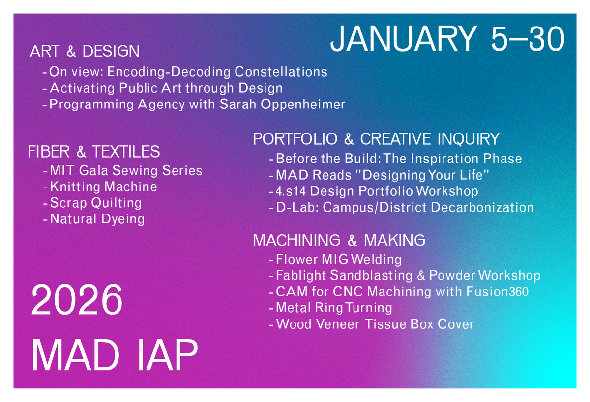 During the Independent Activities Period (IAP) from January 5–30, 2026, the MIT Morningside Academy for Design will offer workshops and activities over a “MAD IAP.”