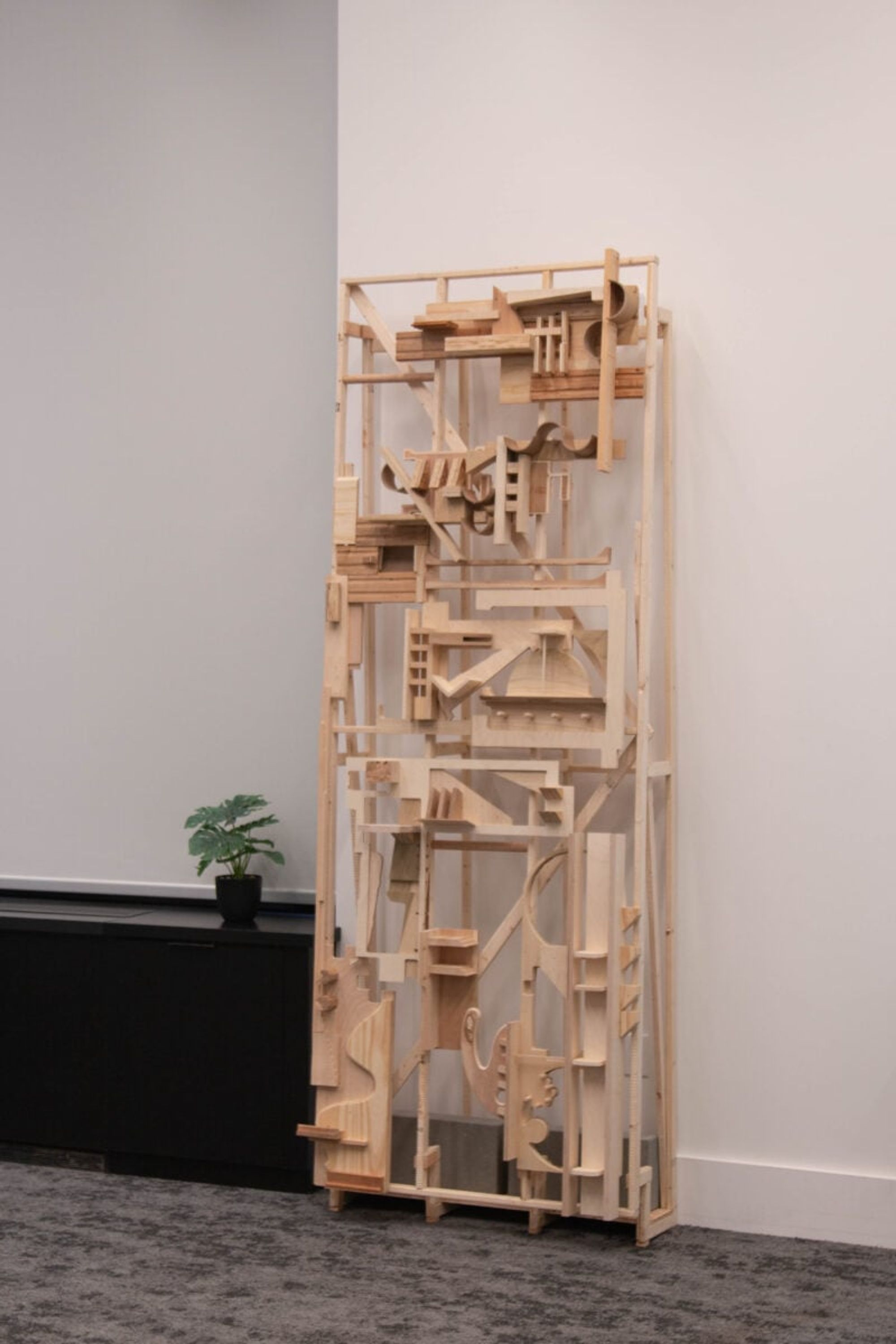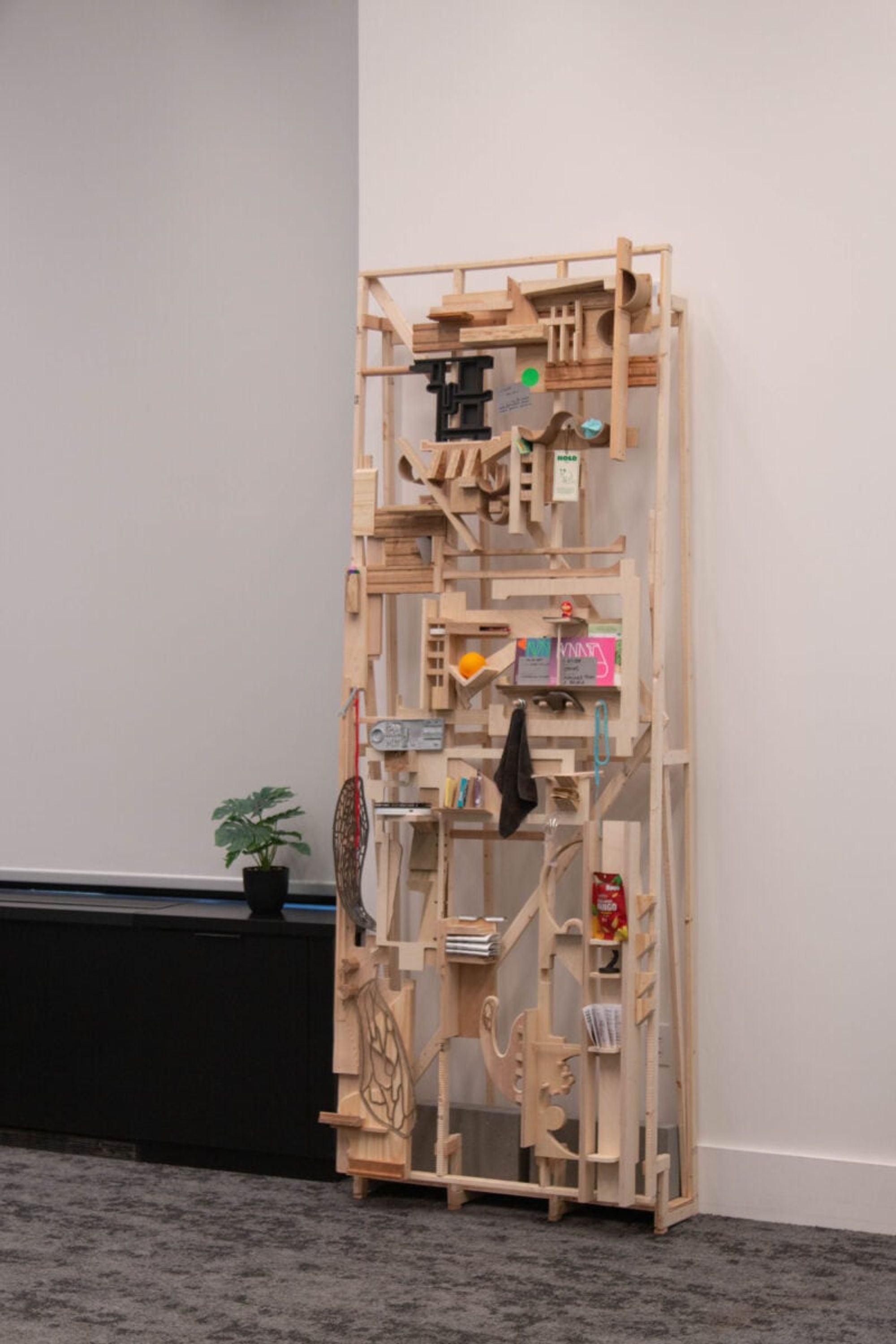 • The class culminated in groups of two or three teaming up to design an “intervention in the DEN,” or Dynamic Engagement Node (a multi-purpose room just off the main Infinite hallway, most often used as a study space for students with an awkward break between classes). I had the opportunity to work with an architecture grad student from the Harvard Graduate School of Design (GSD) to create “Useless Shelf”, a uniquely shaped structure using wood shop scraps meant to combat the liminality, staticness, and isolating quality of the space.